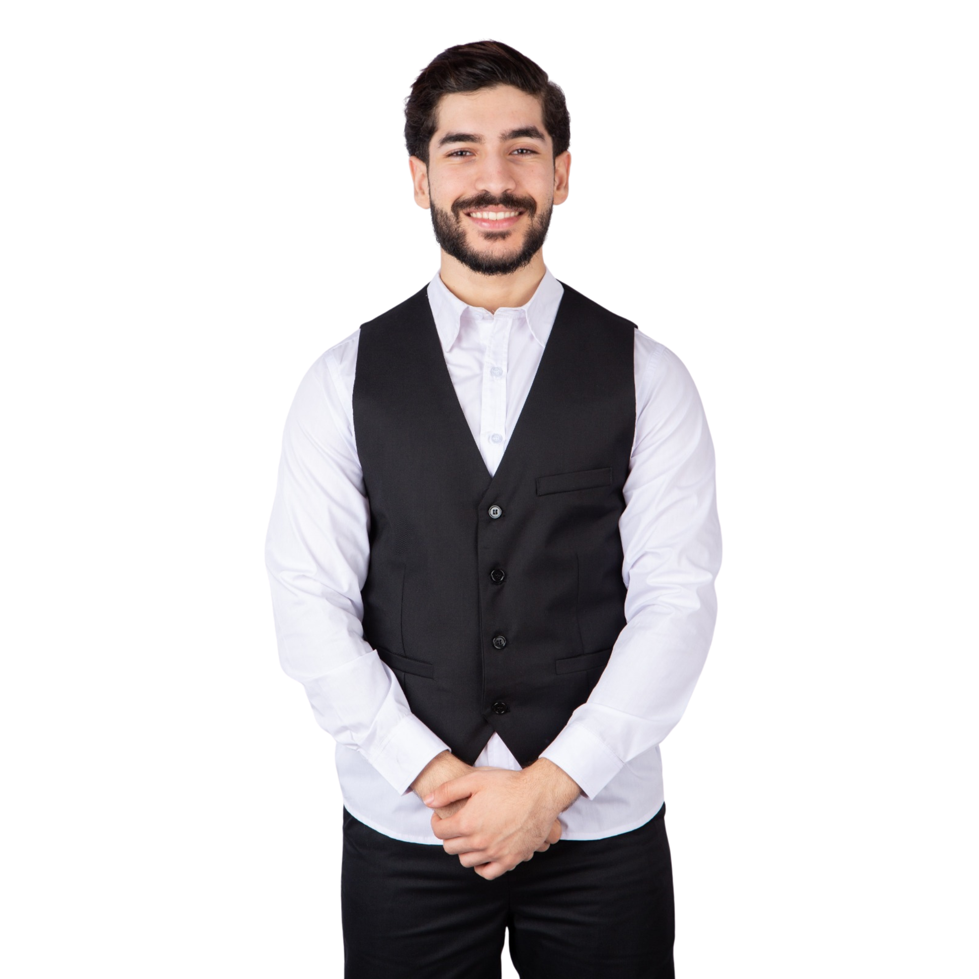 Chaleco de corte clásico para caballero con escote en pico y con cierre frontal de 4 botones.